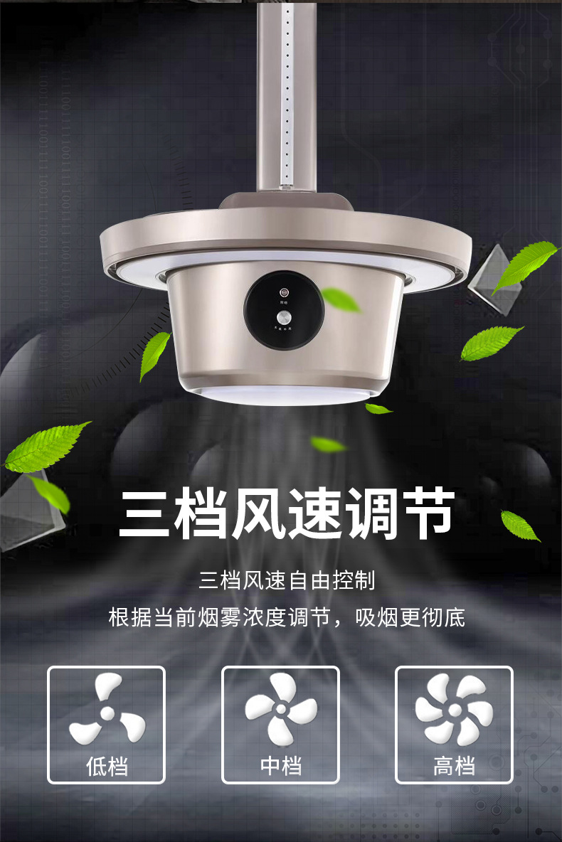 吸力大,聲音小,重量輕。360°環吸設計,節省管道耗材。可在室內制造空氣循環,全方位凈化空氣吸煙攏煙效果卓越。