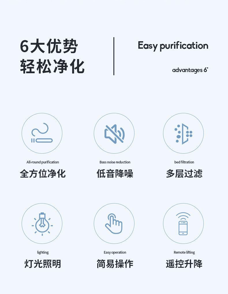【功能】三色變光照明、大功率吸煙、遙控觸屏雙控
